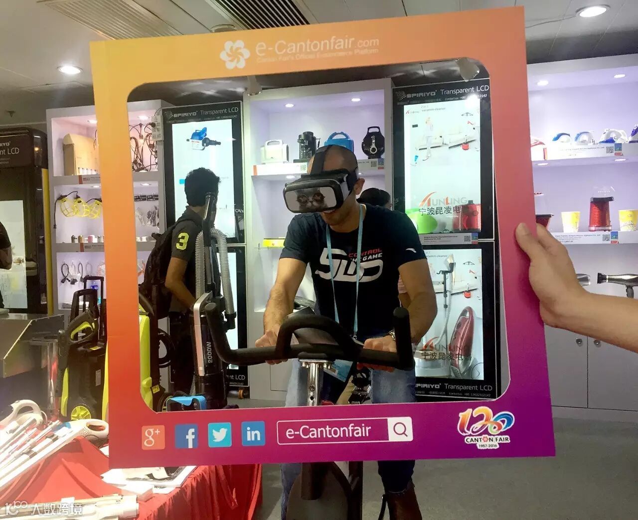 (图:采购商在广交会电商新品发布中心体验VR踩自行车)
