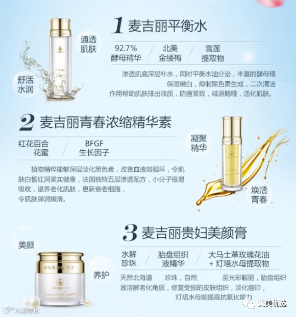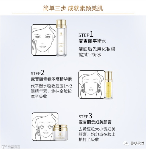 这是一套全能的保养品,第1步平衡水:二次清洁皮肤、抑制黑色素生成、收缩毛孔!第2步青春浓缩精华:28天还原婴儿肌,小分子易吸收、深入基底层淡化痘印斑点、补水保湿去暗沉!第3步贵妇美颜膏:代替粉底液bb霜,美白嫩肤,神奇至极,孕妇哺乳期都可用,安全无刺激。