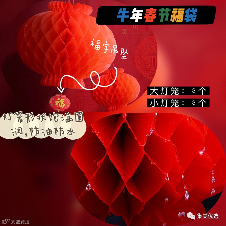 【规格】礼包纸袋*1/对联1.5米*1副+1.2米*1副/财神*1张/辉春*6张/车贴*1张/大“福”字*1张+小“福”字*6张/3D植绒牛娃大*2张+植绒牛娃小*2张/大红包6个+小红包6个字窗花*20张/大灯笼*3+小灯笼*3