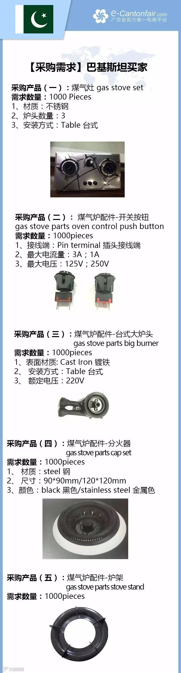 买家背景:买家公司是来自于巴基斯坦的贸易公司,专注于煤气灶及配件的采购。现通过广交会电商平台寻找优质的中国供应商作长期合作。