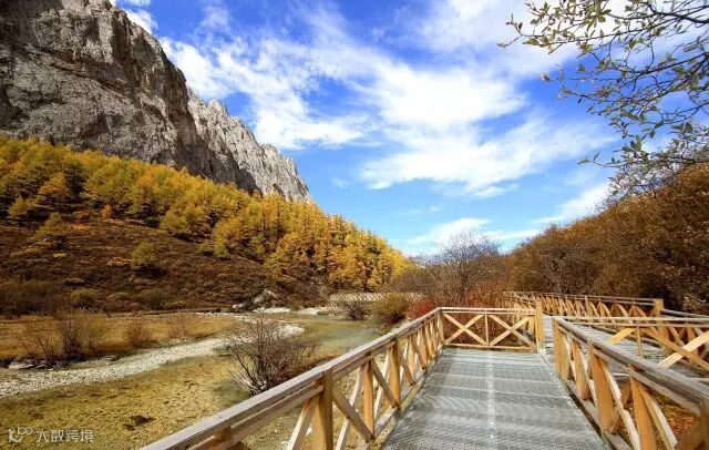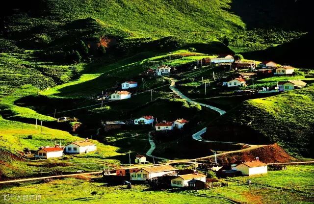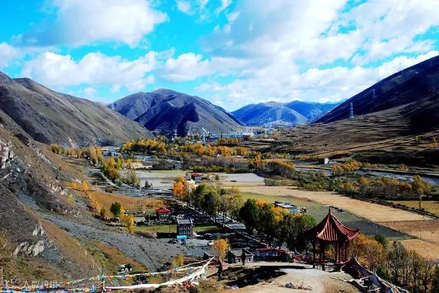 无垠的草甸,曲折的溪流,金黄的秋叶,山坡上大片牛羊在安详的觅食,远处散落着几簇藏族村寨,这就是新都桥,号称“摄影家的天堂”。