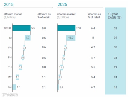 东南亚电子商务市场在2015年和2025年的预计数据(图:谷歌、淡马锡控股公司)