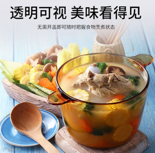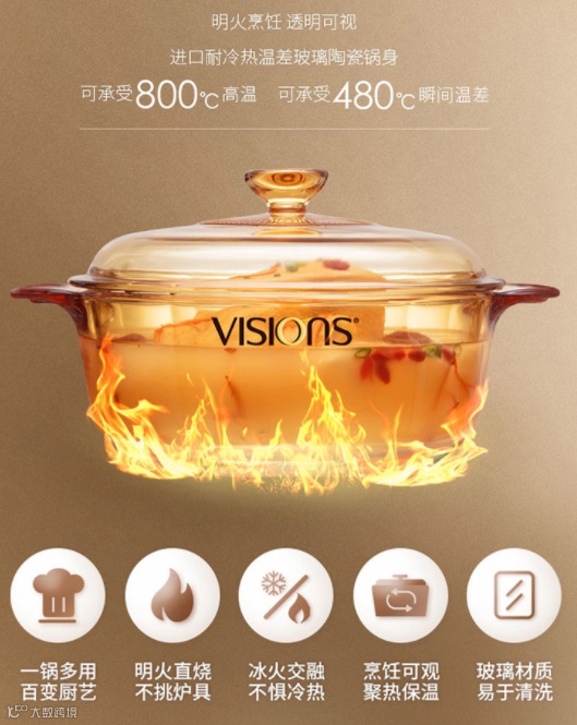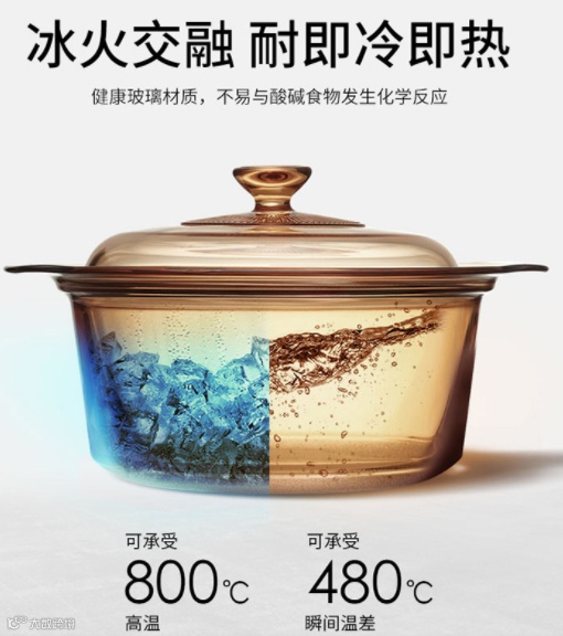 市面上的玻璃锅至多耐热120°,而康宁晶彩锅可以耐受 800℃ 的高温,还是明火加热,加热后放进冰上不会破!