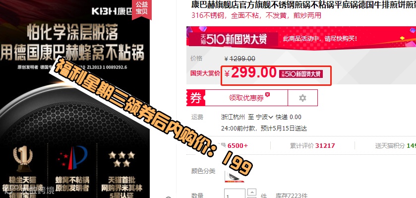 康巴赫不锈钢煎锅不粘锅平底锅德国牛排煎饼煎蛋锅 送锅铲 原价:299元 福利星期三领券后内购价:199 元