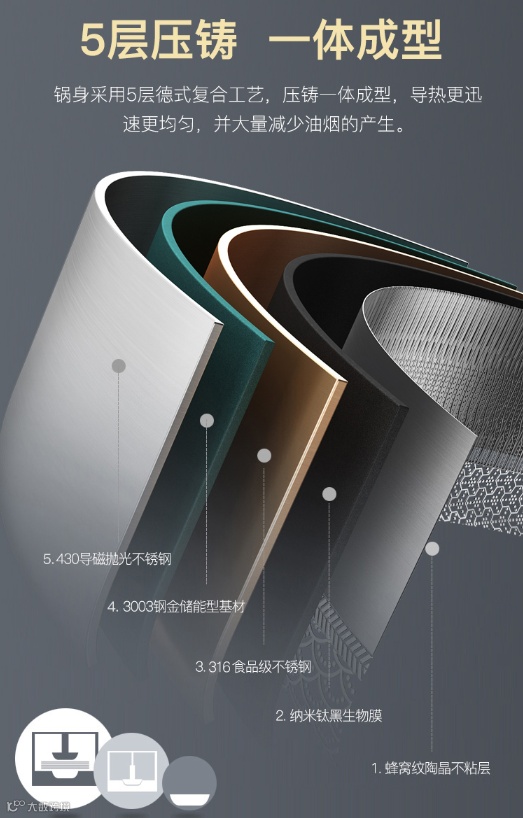 由三种金属材料复合而成,锅里面采用的是18-8(304)食品级不锈钢材料,中间是3003的合金铝,外面是430不锈钢。五层!