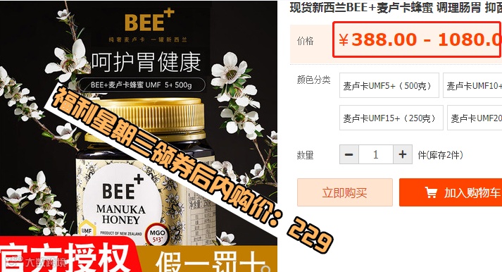 新西兰BEE+麦卢卡蜂蜜 调理肠胃 抑菌养胃UMF5+(500g) 原价:298元 福利星期三领券后内购价:229元