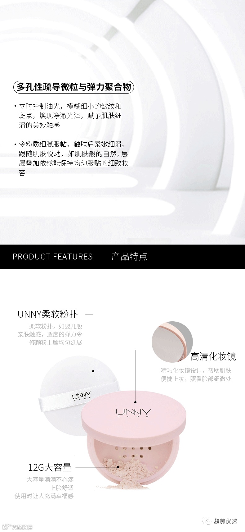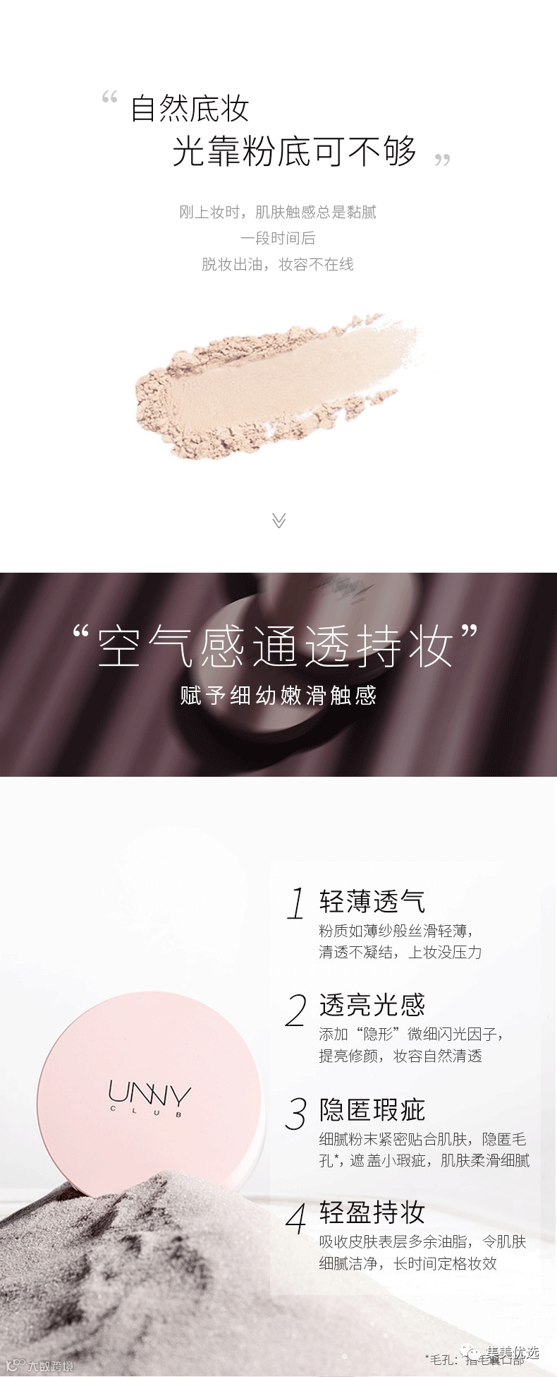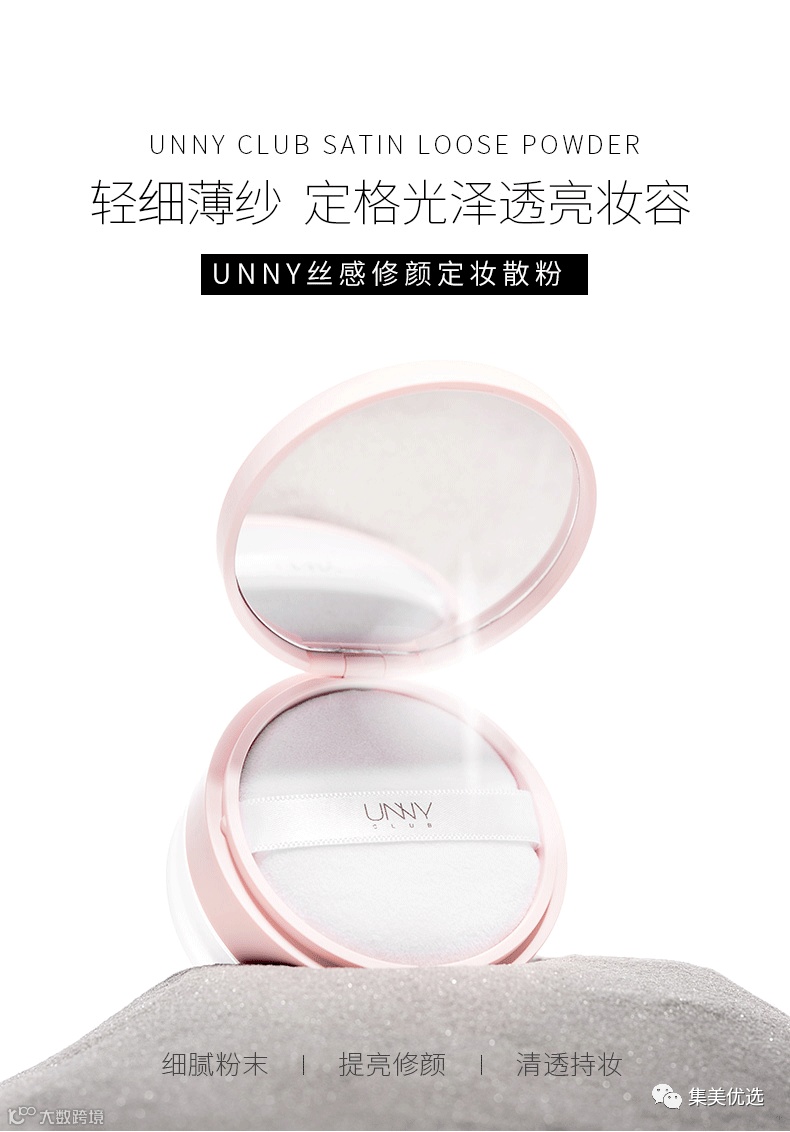 上脸一秒柔焦,隐形毛孔,在脱妆的时候轻轻补一层散粉,会让妆面重新回归哑光干净的状态啦,UNNY散粉在的话就会让我有安全感,再也不用担心夏日脱妆的尴尬啦!