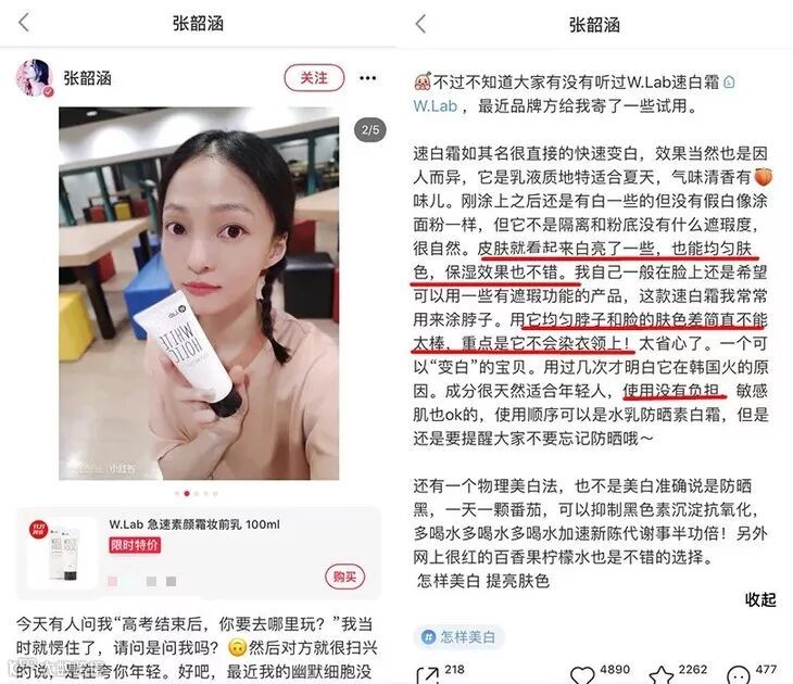 童颜女神张韶涵在她的笔记里写了这款速白霜能亮白、均匀肤色、保湿效果很不错,她用来均匀脖子和脸的肤色,不会染衣领上,使用没有负担。