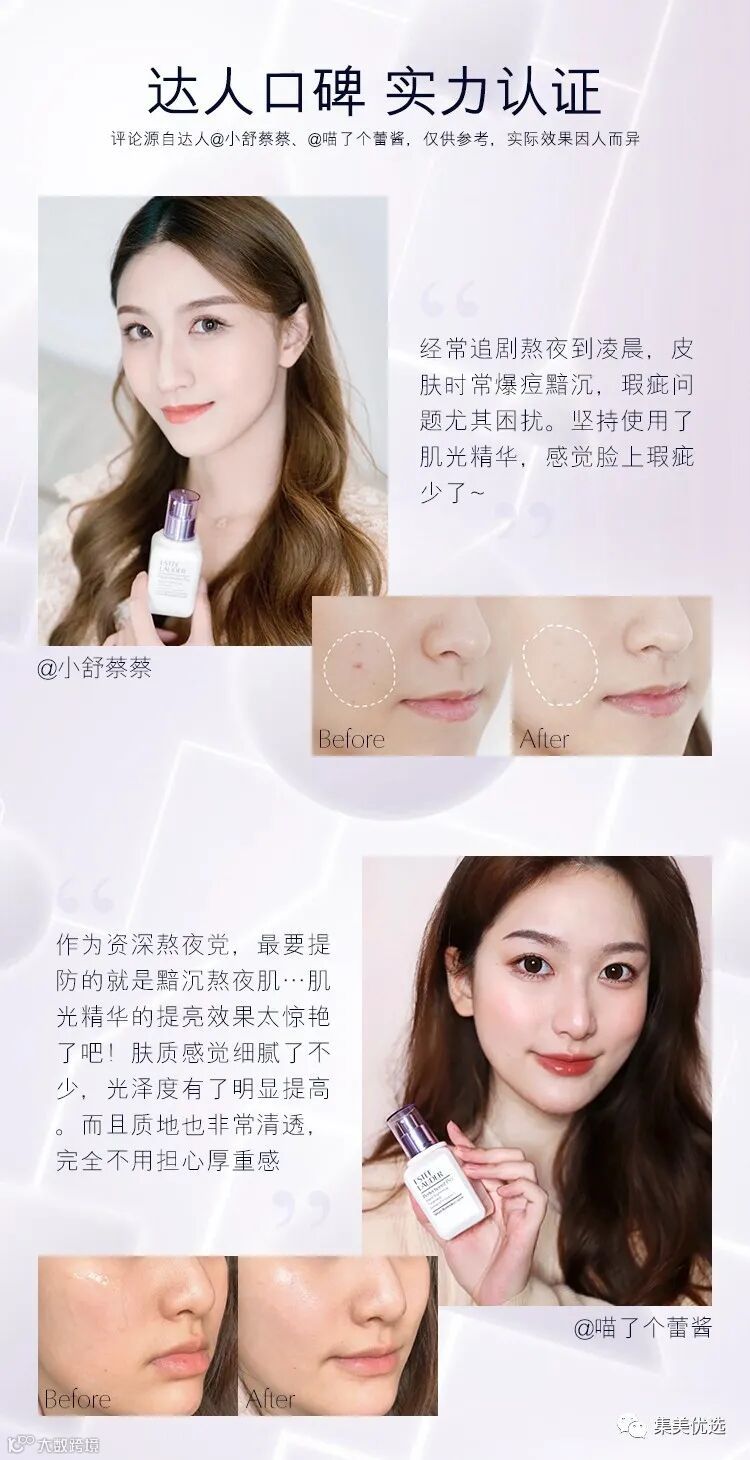上市不久奖状就拿了不少,雅诗兰黛专研F²+AA2G就像个灵敏的探针,能灵巧地定位到需要协助吞噬黑色素的细胞上,蕴含三大有效成分来协同合作:稳定的VC、糖蜜酵母、酵母精粹,三大成分,分别作用于黑色素产生的前、中、后,让黑色素不在胡作非为,从根源提升肌肤的光泽度,尤其是对新生痘印效果非常明显。