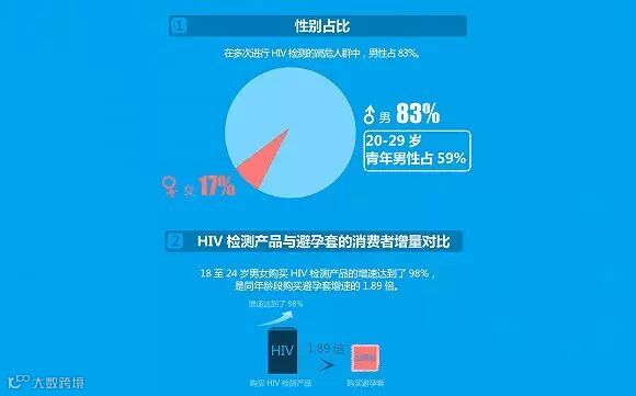 报告显示,2015年,在阿里零售平台上重复购买HIV检测产品的高危人群中有83%是男性,20至29岁的男性占了高危人群的近六成。其中,18至24岁男女购买HIV检测产品的增速更达到了98%,是同年龄段购买避孕套增速的1.89倍。这也就意味着85后、90后发生高危性爱行为的几率更高,也更需要健康、安全的性爱教育引导。