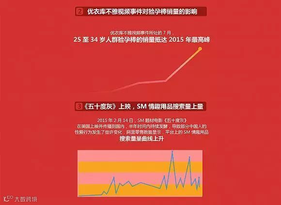 无独有偶,7月15日,优衣库试衣间不雅视频被传到了网上。当日,“优衣库”这个词的搜索量在阿里零售平台达到了双十一的近18倍,同一天,避孕套的销量达到了一个小高峰,日环比增长150%;当月,25至34岁人群验孕棒的销量抵达2015年的最高峰。