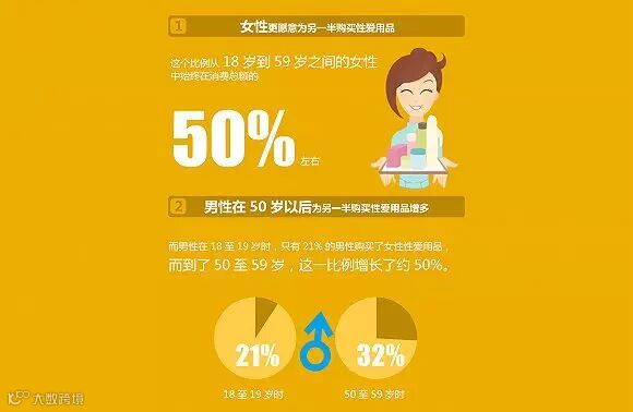 另一个明显的趋势是中国人越来越正视自己和性伴侣的性爱需求。随着年龄增加,男女为对方购买性爱用品的比例越来越高。在阿里零售平台上,女性消费者比男性更愿意为另一半购买性爱用品。在18岁到59岁之间的女性中,这个比例始终在消费总额的50%上下徘徊。随着年龄的增长,男性为伴侣“性趣”买单的增幅则更加明显。在18至19岁时,只有21%的男性购买了女性性爱用品,而到了50至59岁,这一比例增长了约50%,有32%的男性愿为伴侣买单。