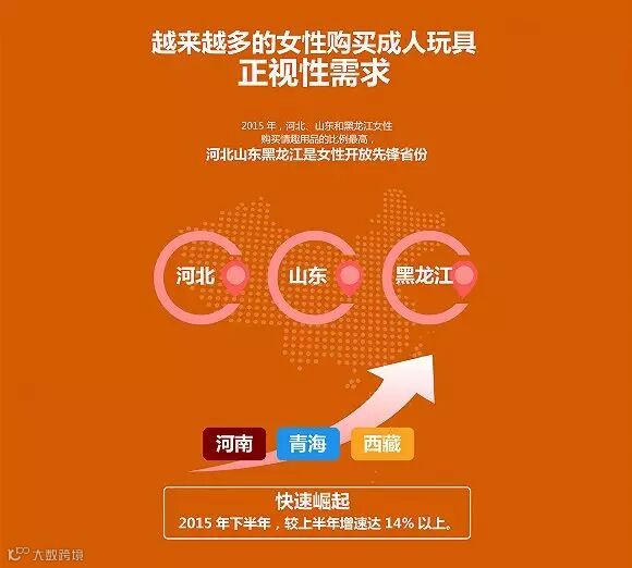 与此同时,女性购买情趣用品的比例也在不断增长。其中,河北、山东和黑龙江女性购买情趣用品的比例最高。2015年下半年,河南、青海和西藏的女性购买情趣用品的增速最快,均在14%以上。