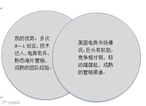 像一个标准的理科生一样,我画了两个圆来比较交集,帮助自己思考。第一个圆是我十多年互联网从业经验的积累:从美国拿到物理博士,2004年我成为中国第一家博客网的创始人,然后跟随马云创业,做淘宝移动的总经理,再到专做海外电商的兰亭集势的 CTO,并带领兰亭美国上市。我想我个人的优势在于技术驱动和有资本逻辑的商业变革。并且因为兰亭集势当时是谷歌亚洲区的第一大广告主,做的是全世界发达国家的生意,所以我对效果类的海外营销很精通。