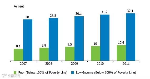 为什么呢?不了解的国人往往认为美国是一个橄榄球型社会,相对中产阶级巨大,其实根据美国统计局2014年的统计,大约4500万的美国人属于贫困人口,而高达三分之一、近一亿的的美国人属于低收入群体(家庭年收入低于5万美金),也就是三分之一的人口并不富裕,这是一个典型的M型社会(参考大前研一的《M型社会》)。这部分人每个月把衣食住行的基础花销花完就不剩多少钱了,也得精打细算过日子。为了方便理解,我们把这部分人群定义为美国的“屌丝”群体。