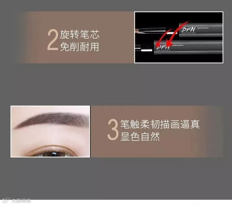 画眉的时候很顺滑,我很喜欢出汗,以前用的一些眉笔,不知道什么时候,眉尾会被抹掉,尴尬太多了!不过我用了DFN眉笔之后,还没有哪次掉过,一天到晚都能完好无损,防水防汗效果是的确很棒