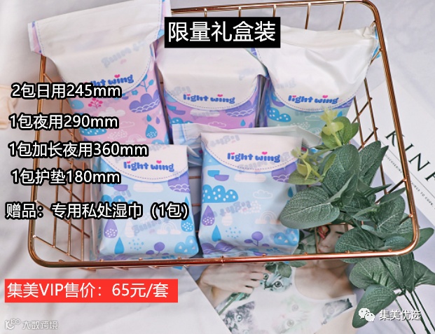 【大牌团购】限量礼盒装 韩国light wing轻翼卫生巾组合套装日夜用加长护垫5包 赠送女性湿巾一包 原价:89元 VIP /黑卡M1会员 福利补贴价:65元 相信每位精致的女生 都对每个月的大姨妈可谓爱恨交加 正因每个月都需要用卫生巾 所以我们与卫生巾的关系密不可分