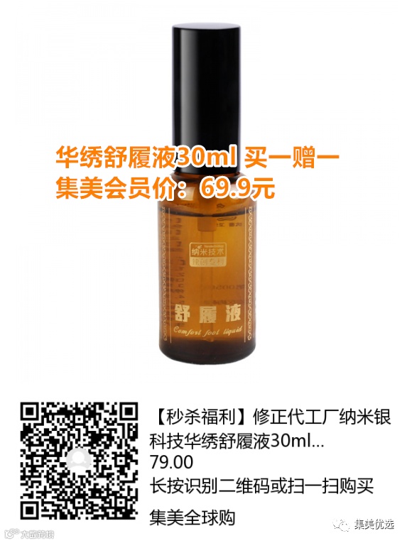 【限时秒杀】修正代工厂 纳米银科技 华绣舒履液30ml买一赠一 团购价:79元 VIP /黑卡M1会员 福利补贴价:69.9元 “脚气”虽不算啥大病,却能把人折磨的没脾气!最可怕的是,家里要是出现了一个“脚气”,若不及时“隔离”,极有可能全家沦陷!