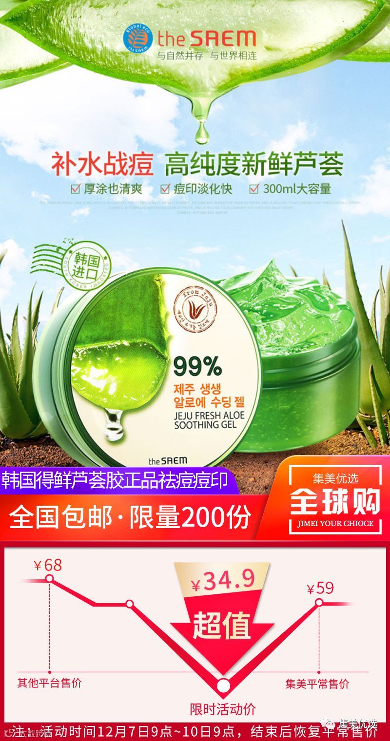 来源于济州岛天然植物原液,成分天然又温和,99%的高芦荟含量,