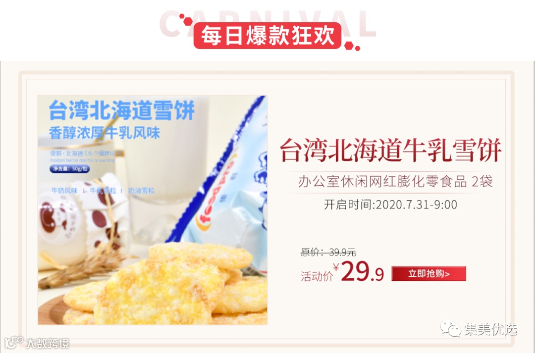 【大牌团购】台湾北海道牛乳雪饼仙贝雪米饼牛奶风味办公室休闲网红膨化零食品 2袋 原价:39.9元 VIP /黑卡M1会员 福利补贴价:29.9元