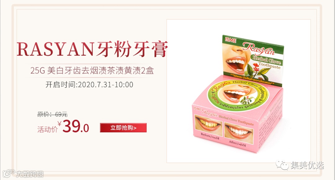 VIP /黑卡M1会员 福利补贴价:39元 相信一定有很多仙女们都希望 自己有一口洁白的牙齿吧, 听闻泰国这款RASYAN牙粉效果十分神奇 长期使用效果 祛除口腔异味、清新口气、祛除牙渍