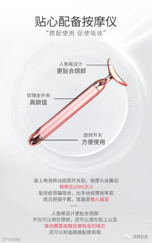 重要的是还送一个按摩仪,用它效果更好而且抹得更快,可以说事半功倍。按摩仪很贴合脖子的弧度,按摩起来特别舒服。坚持每天5分钟,迷人天鹅颈终会出现。