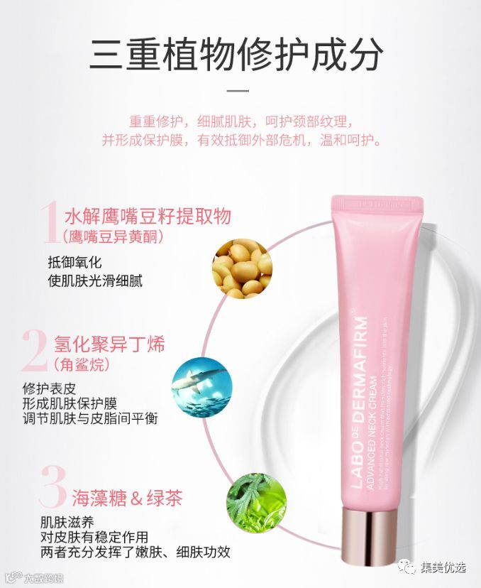 再配合角鲨烷、大豆异黄酮、海藻糖、绿茶提取物,补充水分和胶原蛋白,让颈部肌肤弹润有光泽,细胞重新充盈起来。强效保湿抗老化,同时紧致美白,多管齐下。