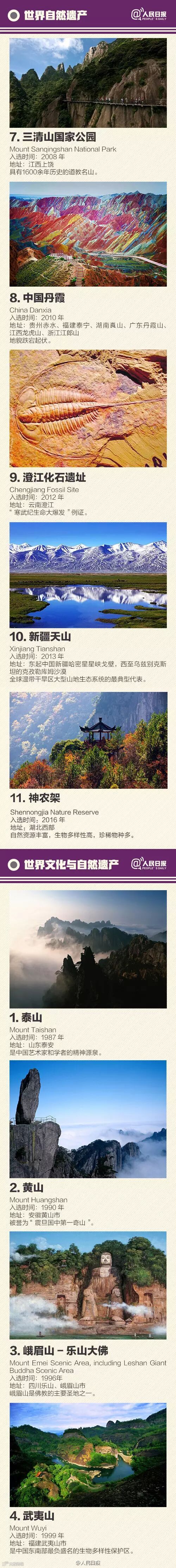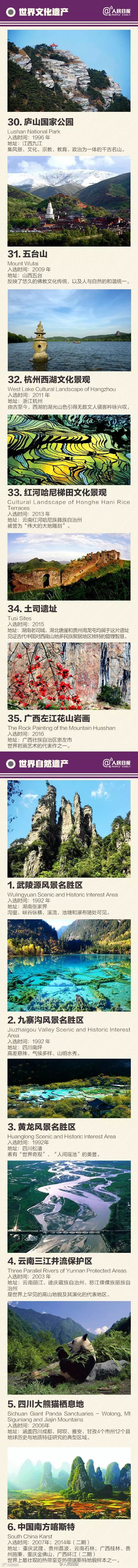 17日,我国湖北神农架,成功列入世界自然遗产名录。此前,广西“左江花山岩画文化景观”也申遗成功。至此,我国世界遗产总数已达50项!长城、明清故宫、莫高窟、京剧、中医针灸……中国50项世界遗产+38项非物质文化遗产全名录↓丰富的遗产,是文明印记,了解!