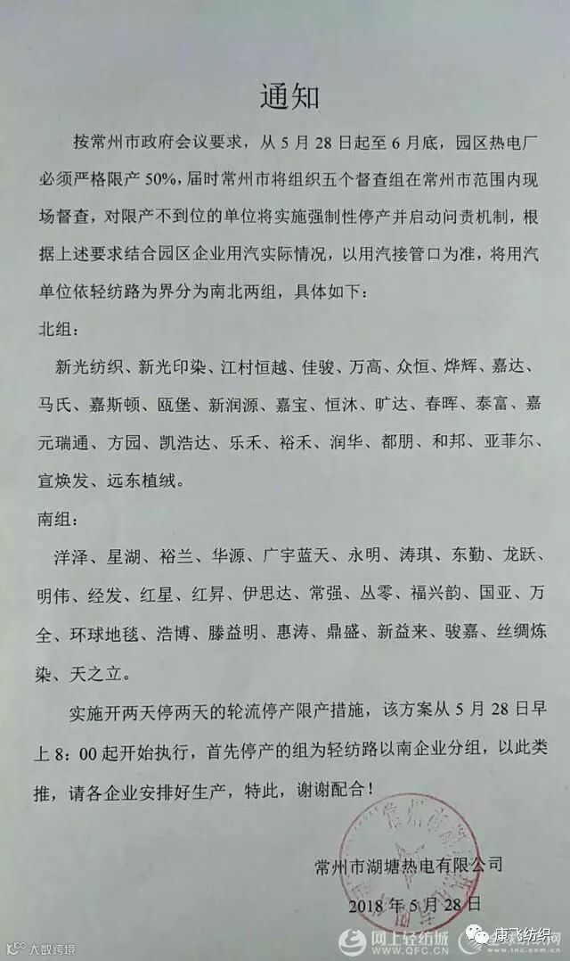 按常州市政府会议要求,自5月28日至6月底,园区热电厂必须严格限产50%,届时常州市将组织五个督查组在常州市范围内现场督查,对限产不到位的单位将实施强制性停产并启动问责机制,根据上述情况要求结合园区企业用汽实际情况,以用汽接管口为准,将用汽单位依轻纺路为界分为南北两组,具体如下:
