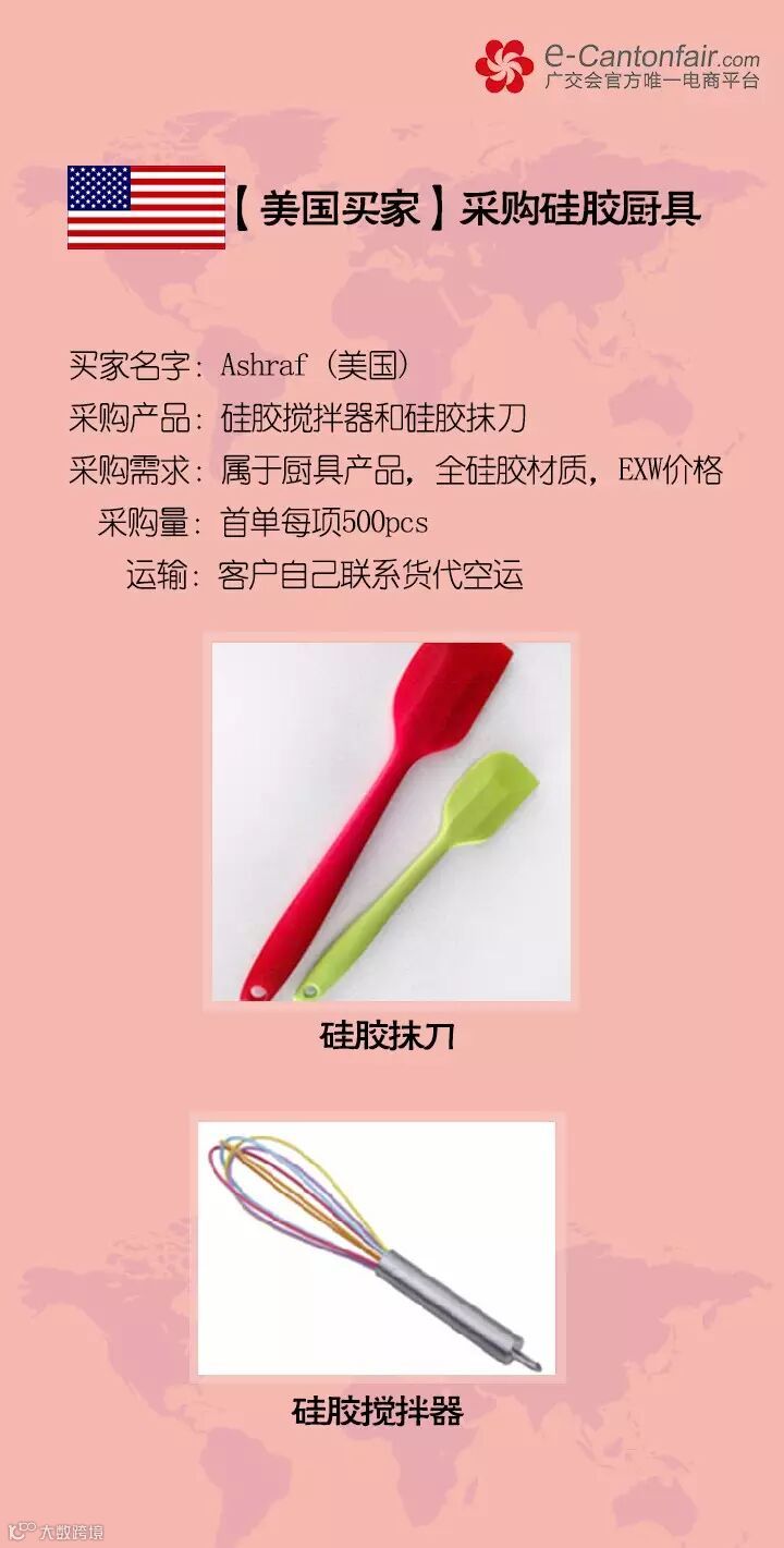 这是一宗来自美国的采购需求,采购硅胶厨具,要求卖家自己联系货代空运。
