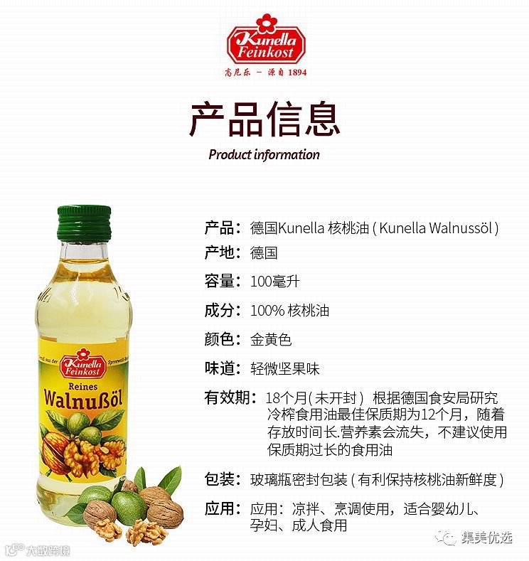 纯天然德国制造Kunella高尼乐核桃油 - 补脑佳品 Kunella reines Walnussöl