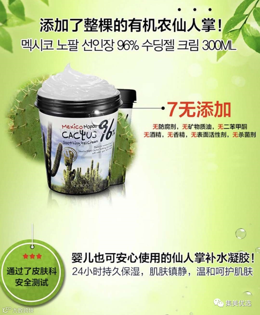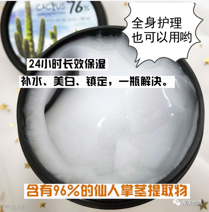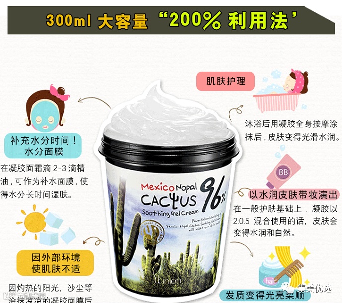 平时买个普通的面膜一盒十片也要一两百,这罐韩国面膜300Ml真是平价面膜里的战斗机了!成分安全,7无添加,主要提取96%的仙人掌茎提取物。一罐可以用好久,功效是能24小时长效美白补水,更重要的是任何肌肤,任何年龄段都能够安心使用!