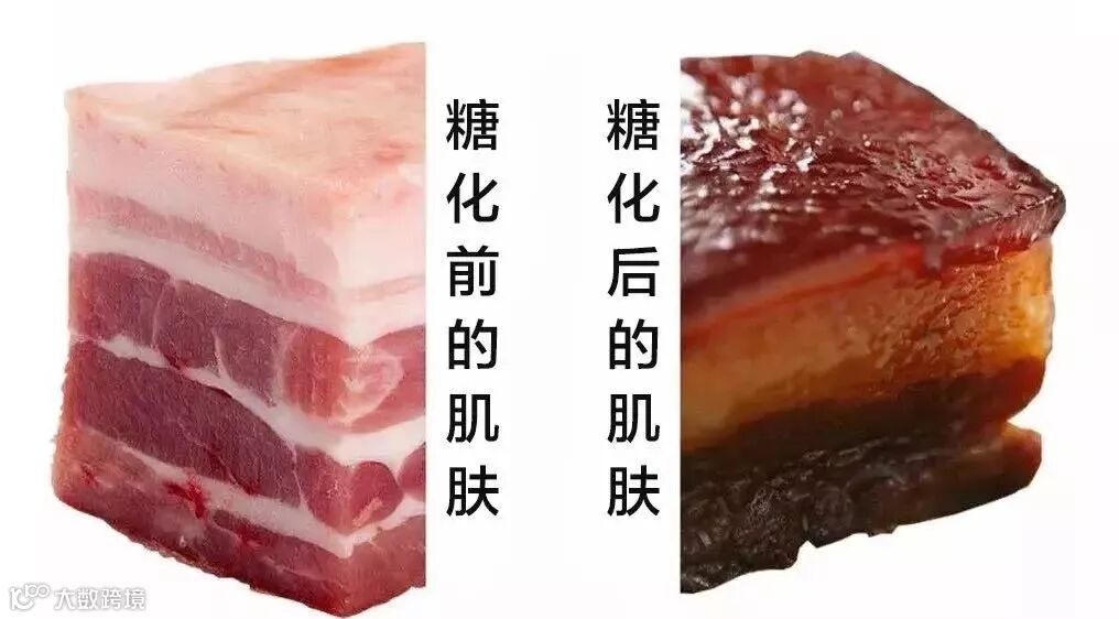 糖化后的肌肤,会失去弹性,又黄又松弛,引发脸上各种痘痘、松弛、暗沉,一个典型的案例就是红烧肉。