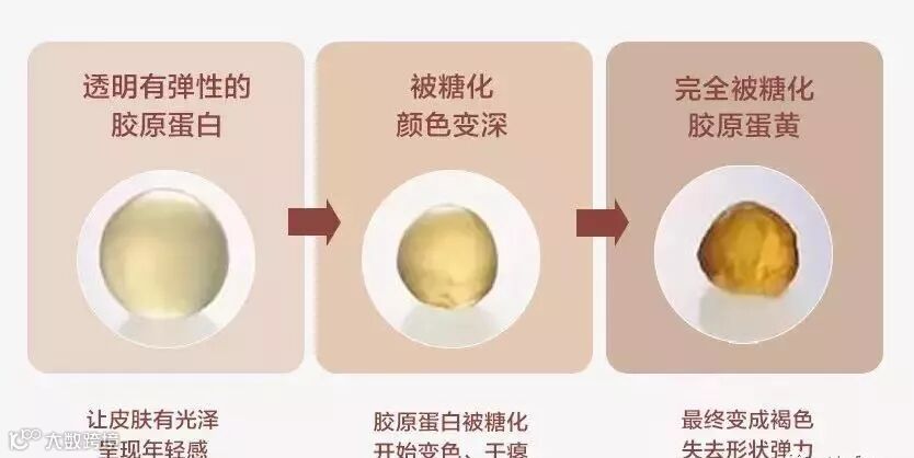 我们吃的糖,会和肌肤的胶原蛋白反应,最终变成:又黄又硬的“胶原蛋黄”(AGEs),这就是糖化过程。