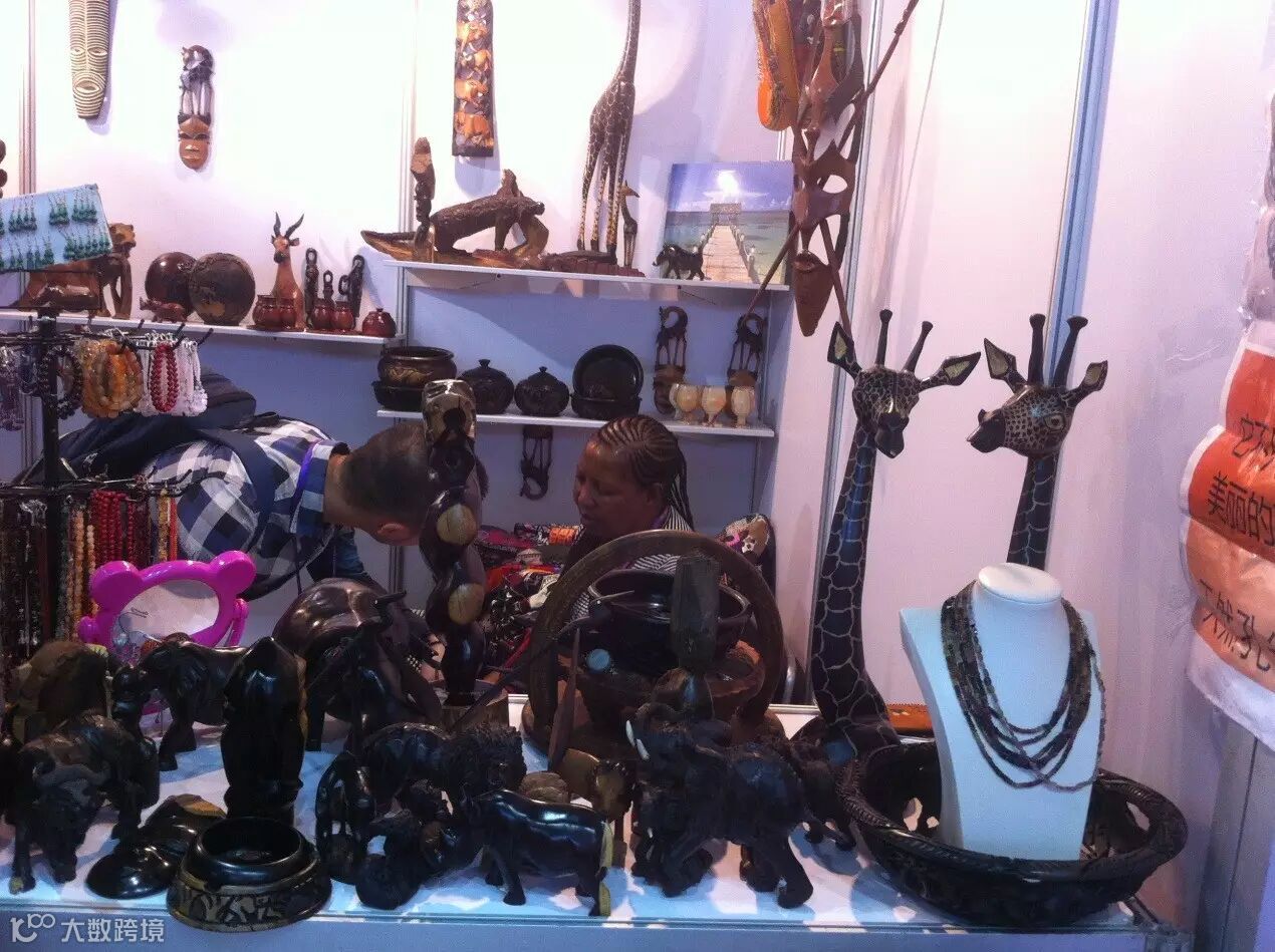 6.非洲工艺品展位上的原始粗犷的风格引人注目。 展品包括各类木雕,都是非洲大草原的动物造型,狮子、大象、长颈鹿等,还有非洲腰鼓。