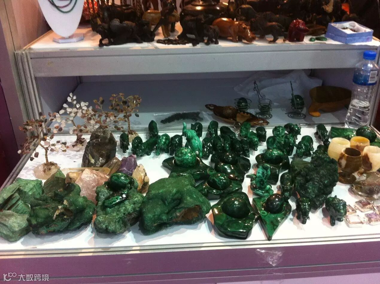 8.非洲孔雀石工艺品。展商称,孔雀石有安神的功效,这些东西摆放到房间里,时间久了,慢慢就有效果。右下角的蛋形孔雀石售价1200元。
