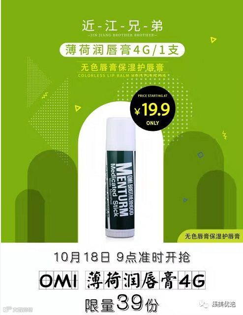 近江兄弟薄荷润唇膏,可以说是非常亲民了~蕴含保湿滋润舒缓因子,无着色,微香性,不含化学剂,因此受到广大消费者的喜爱!