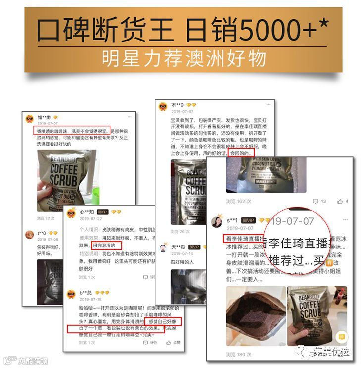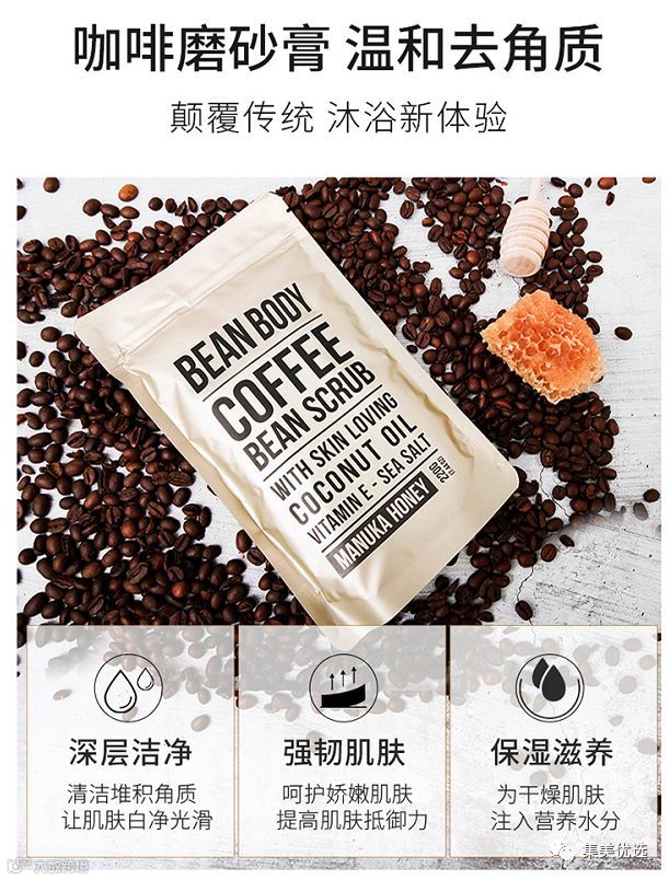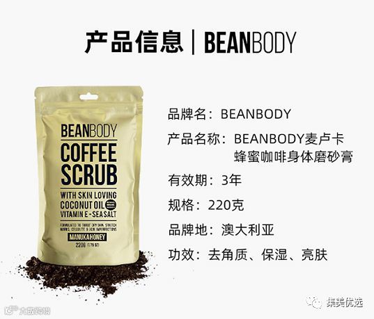 【大牌团购】BEAN BODY 麦卢卡蜂蜜咖啡去鸡皮身体磨砂膏 220克 团购价:129元 VIP /黑卡M1会员 福利补贴价:119元 范冰冰都爱用的身体磨砂膏,据说用5分钟就可以拥有婴儿般的肌肤,口碑和效果都超好!