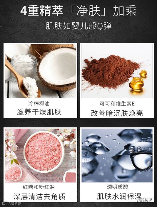 四种超级明星成分。能对肌肤进行深层清洁,柔和去除老化角质,做到不伤皮肤。