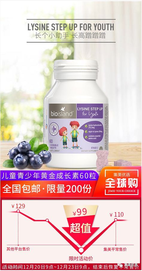 bioisland儿童组长素2段,澳洲bioisland儿童黄金助长素是一种营养补充剂,它的主要成分就是赖氨酸,这种物质的最大作用就是帮助人体更好的摄取蛋白质,均衡人体的营养,从而促进人体的生长发育。当然它的功效远不止这些,它还能够增进食欲,增强人体的免疫力,帮助人体产生抗体,增强体质。通过口服助长素还能够帮助钙的摄取,进步儿童的智力,并防护骨质疏松,营养不好等状况。