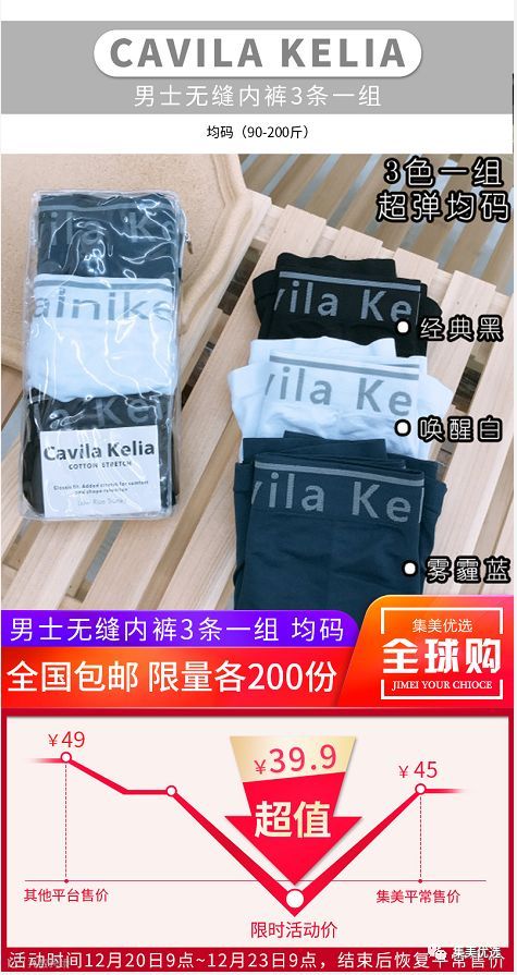 【福利团购】Cavila Kelia男士无缝内裤3条一组 均码(90-200斤)