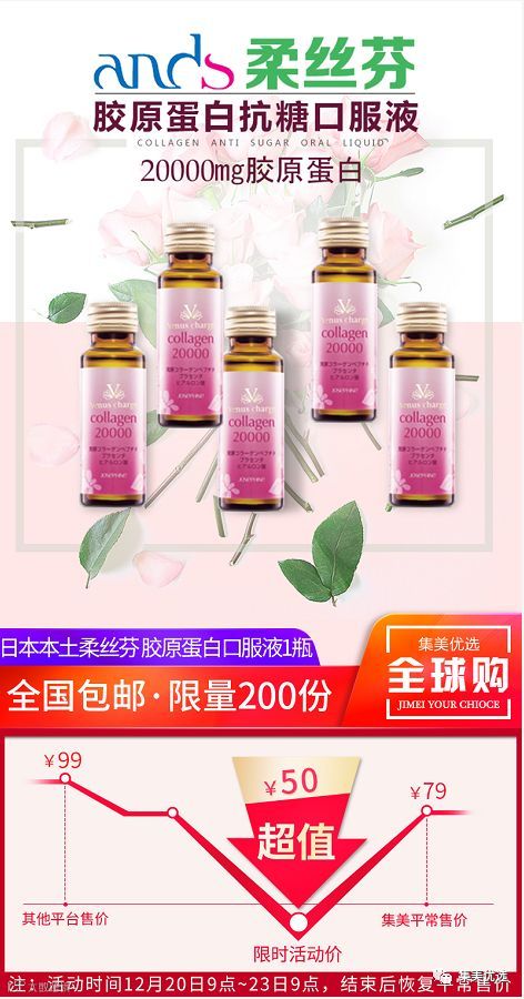 1.每瓶含有20000mg的小分子胶原蛋白,含量更高,更好吸收(目前市面上绝大部分胶原蛋白饮的单瓶含量仅为2500-5000毫克) 。