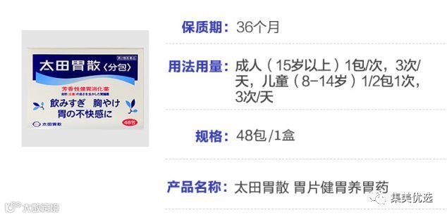 在日本,太田胃散基本上是每个家庭必备。只要胃有点不舒服,吃得过多或饮酒过度,胃痛胃胀的时候,服用太田胃散,可以帮助消化,改善胃胀、返流、烧心和下垂感。如果家里有人消化功能不太强大,或者经常积食,可以考虑买几盒加入家庭药箱。