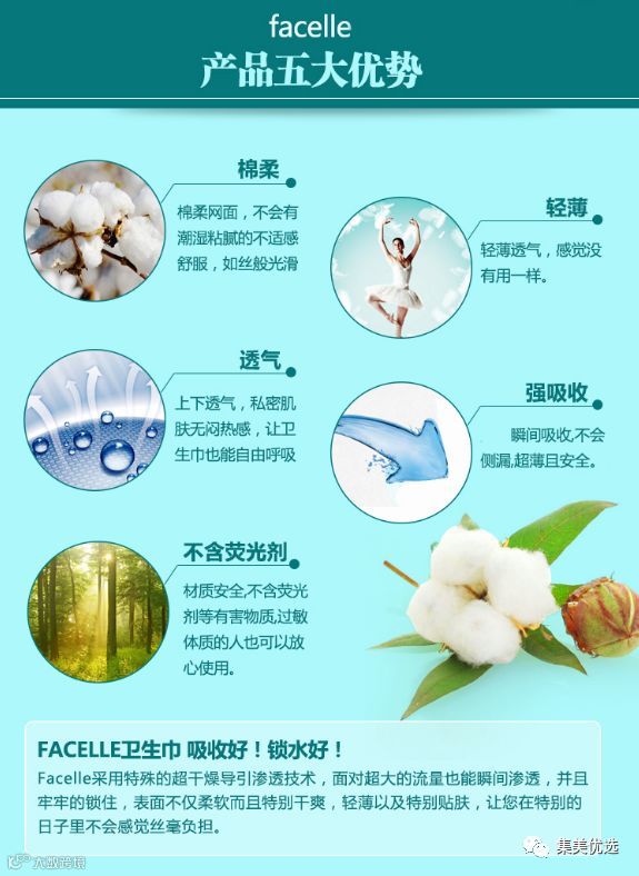 Facelle卫生巾采用特殊的超干燥导引渗透技术,即使面对超大的流量也能轻松快速渗透,并牢牢锁住无侧漏!丝滑表面不仅柔软且特别干爽,超薄型的卫生巾特别贴服,使女性在不方便的日子里也不会感到有丝毫负担。