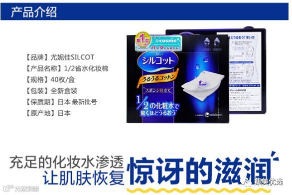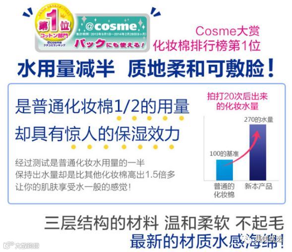 1、使用普通1/2的化妆水具有惊人的保湿效力,拍打20次后出来的化妆水的量,普通的化妆棉以100为基准的话,新产品是270。