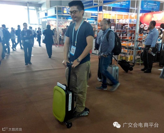 跟智利小伙伴分别之后,来到一个行李箱电动滑板车展位。小编看到,行李箱电动滑板车前面的行李箱可放置行李,上班、乘飞机时十分方便。充两个小时电便可骑10公里,此外还附带手机充电功能。目前售价3000人民币。