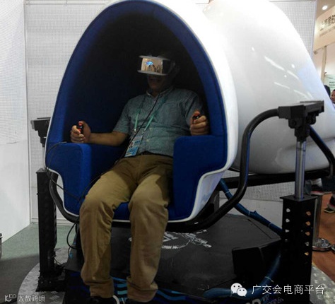 再来看看高科技产品,这是一个9D虚拟体验器,人坐上去可以化身虚拟人物体验各种电脑设置的场景,这个采购商在上面兴奋得双脚都抬起来了。