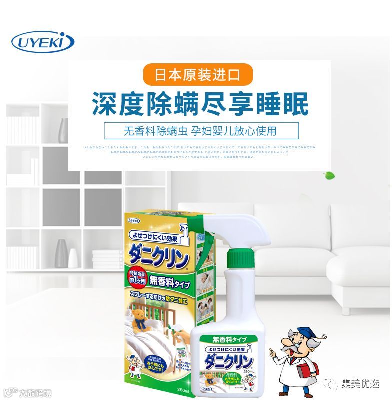 这款日本原装UYEKI专业除螨虫喷剂,主要成分是脂类系羧酸酯,是一种可用于棉被防螨处理的制剂,对防止螨虫危害有显著功效。