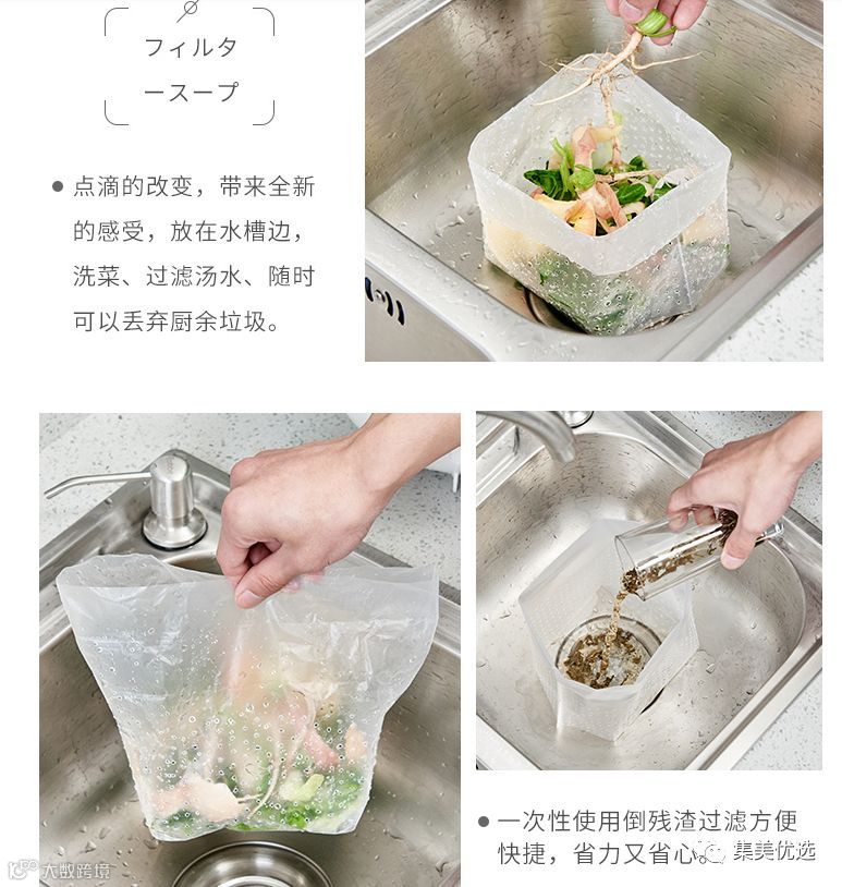 垃圾袋是我们日常生活中必不可少家家户户每天都可以用到的呢,但是这款站立式过滤垃圾袋,可以强效解决你的水槽残渣烦劳哟,省时省力,实用方便,是家庭妈妈们的贴心好帮手哟!