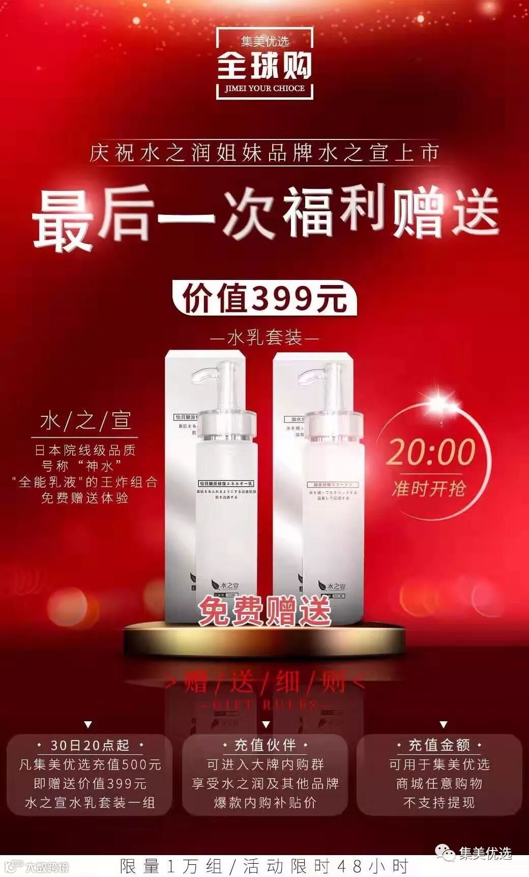 ❶11月30日20点开始, 凡集美优选平台充值500元, 即赠送价值399元水之宣水乳套装一组,充值1000元送两组,以此类推